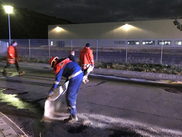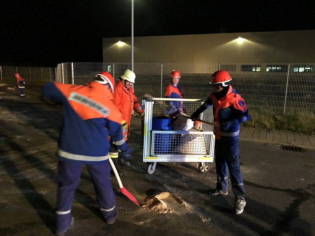Um ca. 19 Uhr ging es dann auch schon mit dem ersten Einsatz los. Einsatzstichwort war „Ölspur in der Marie-Curie-Straße“. Die Jugendlichen rüsteten sich aus und besetzten die Fahrzeuge. Am Einsatzort eingetroffen wurde den einzelnen Trupps ihre Aufgaben zugewiesen, welche die Jugendlichen dann nach und nach abarbeiteten. Nach dem ersten Einsatz war dann erstmal Vespern angesagt, damit alle für die kommenden Einsätze gut gestärkt sind.