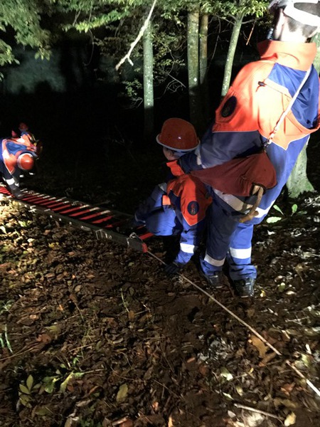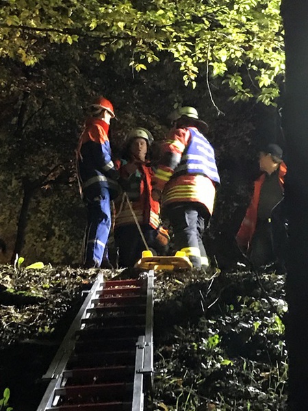 Gegen 21:45 Uhr gab es den nächsten Einsatz für die Jugendlichen. Es handelte sich um eine Person, die Richtung St. Wendel mit dem Fahrrad gestürzt ist und dann einen Abhang nach unten gerutscht ist. Hierbei mussten die Jugendlichen überlegen wie sie die Person von unten nach oben bekommen. Mithilfe einer Leiter und viel Muskelkraft haben sie es nach einer Weile dann geschafft die Person nach oben zu holen.
