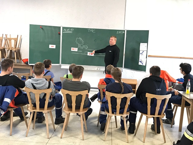 Um 5:30 Uhr war die Nacht dann wieder vorbei, denn es wurde ein Alarm für den Kindergarten in Hohebach abgegeben. Dort angekommen mussten die Jugendlichen allerdings feststellen, dass es sich um einen Fehlalarm, bzw. um einen mutwillig abgesetzten Alarm handelte. Also ging es wieder zurück nach Dörzbach um sich noch ein bisschen auszuruhen. Ca. 1 Stunde später, um 6:30 Uhr, ging schon der nächste Alarm los: „Brandmeldeanlage Firma Arnold“. Dort angekommen ging es erstmal zur Erkundung mit einem Angriffstrupp in das Gebäude, während der Rest der Mannschaft die Wasserversorgung aufbaute. Da es sich um einen Fehlalarm handelte war dieser Einsatz schnell abgeschlossen. Nachdem alles wieder abgebaut war, zeigte und Kommandant Norbert Hepp die zentrale Brandmeldeanlage und erklärte diese.