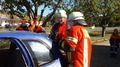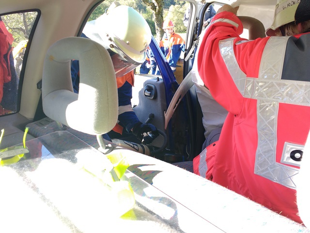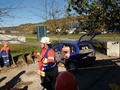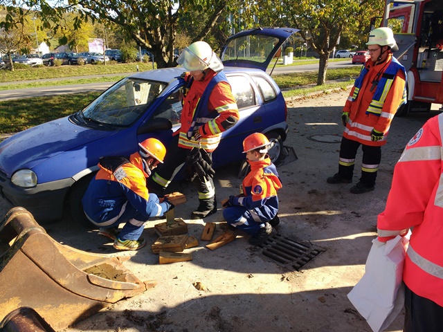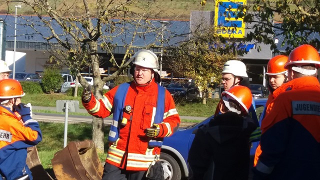 Um kurz vor 11 Uhr ging auch schon der nächste Alarm los. Diesmal hieß es „Verkehrsunfall- PKW gegen Baum“. Hier mussten die Jugendlichen eine Person aus dem Auto retten und durften das Auto mit den hydraulischen Rettungsgeräten bearbeiten. Hierbei hatten sie die Möglichkeit, gelerntes in die Tat bzw. Praxis umzusetzen.