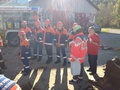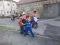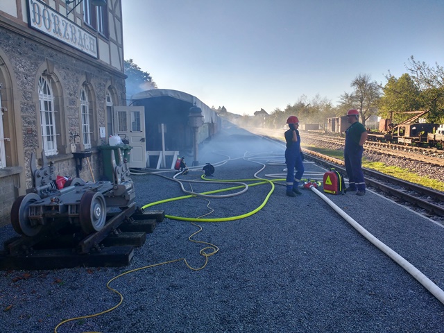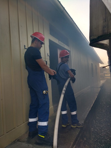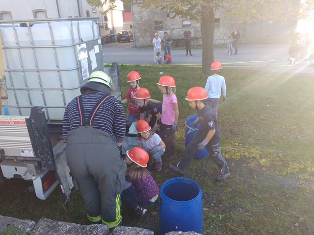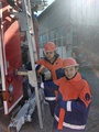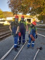 Um kurz vor 16 Uhr traf sich dann auch die Kindergruppe, um an dem letzten Einsatz mitzumachen. Kurze Zeit später löste der Melder dann zum letzten Mal für den Tag aus. Mit insgesamt 4 Feuerwehrautos und dem Taxibus fuhren wir zu der Einsatzstelle an den Bahnhof. Für die Großen hieß es „Personensuche in einem verrauchten Gebäude“, während die Kinder die Aufgabe hatten eine „Wasserversorgung aufzubauen“ um ein kleines Feuer zu löschen und „auslaufende Gefahrstoffe“ aufzufangen. Nachdem alles abgebaut wurde durften die Kinder und Jugendlichen noch eine Runde mit der Jagsttalbahn fahren. Dies war für alle ein gelungener Abschluss des letzten großen Einsatzes.